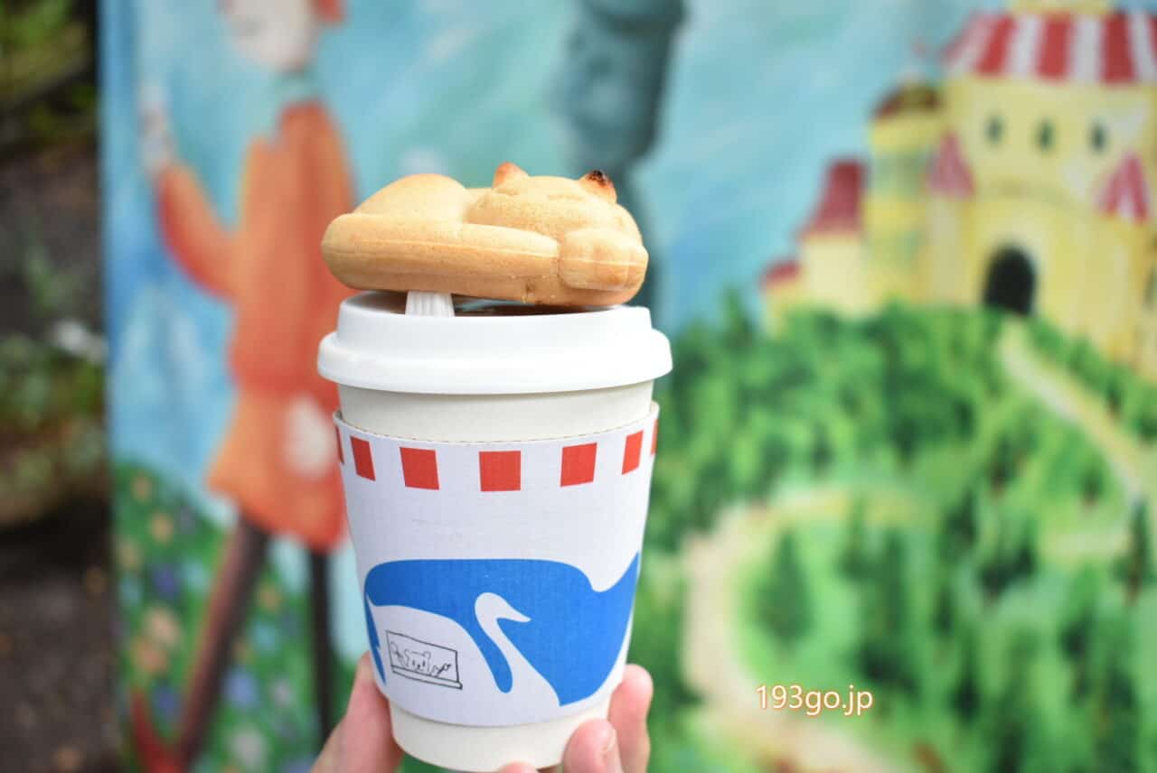 スワンボートをモチーフにしたカップ、名物ねこドーナツも