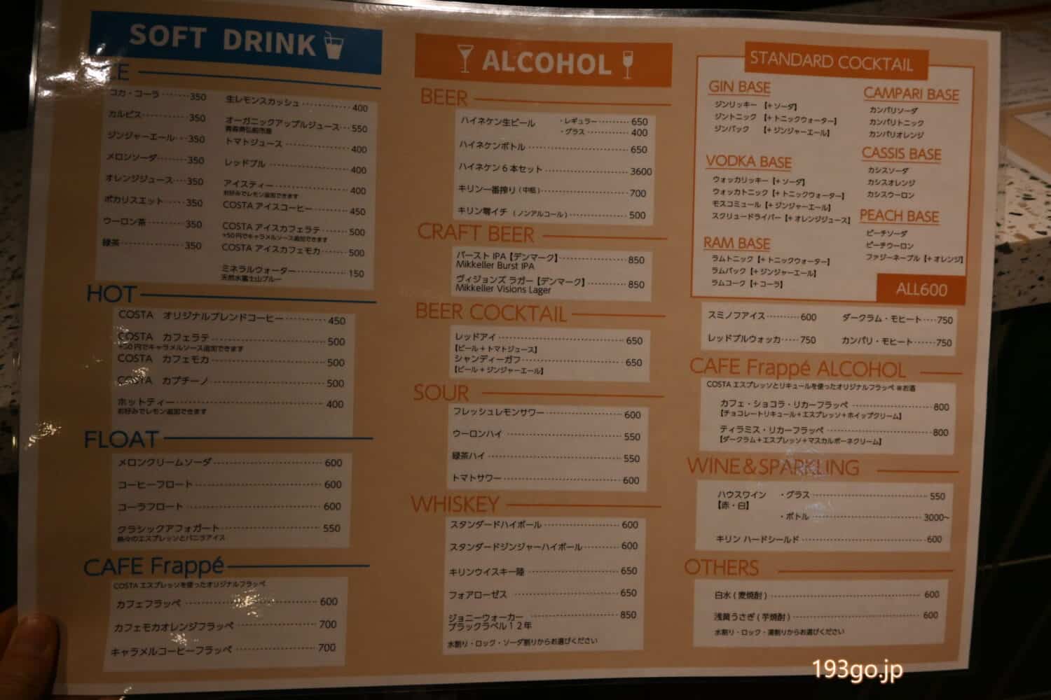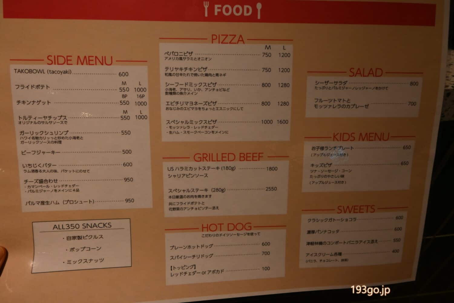 フードメニュー!カフェ併設、レーンからも注文できる。ピザ、ステーキ、スイーツも
