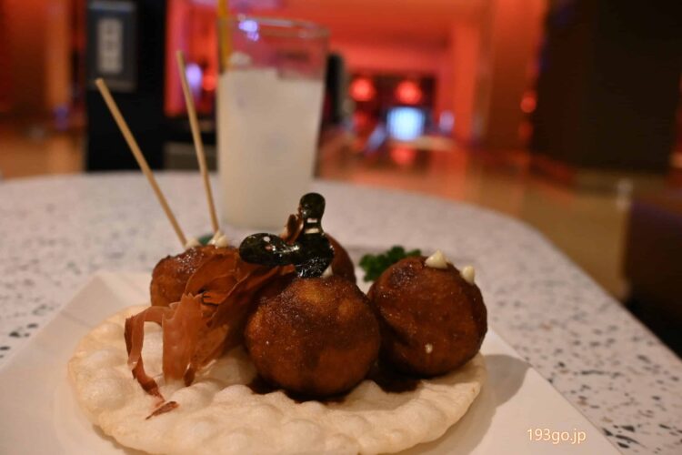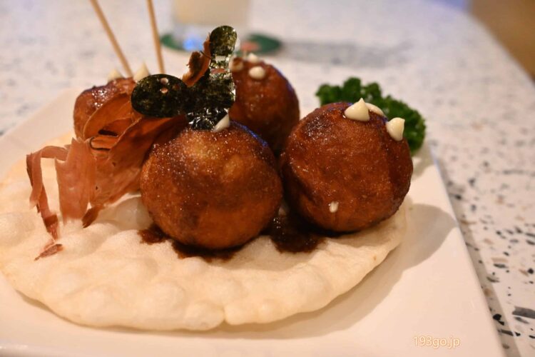 軽やかな白いお煎餅に、揚げたたこ焼き。ソースが浸みていて、カツオブシがフワっと。上に乗っているのはボーリングのピン型の海苔だ。