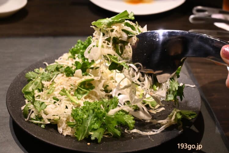 ちゃんぷベースは、クレソン、春菊、キャベツ、ケールをオリジナルたれで和えたシャキシャキサラダ、栄養たっぷり。