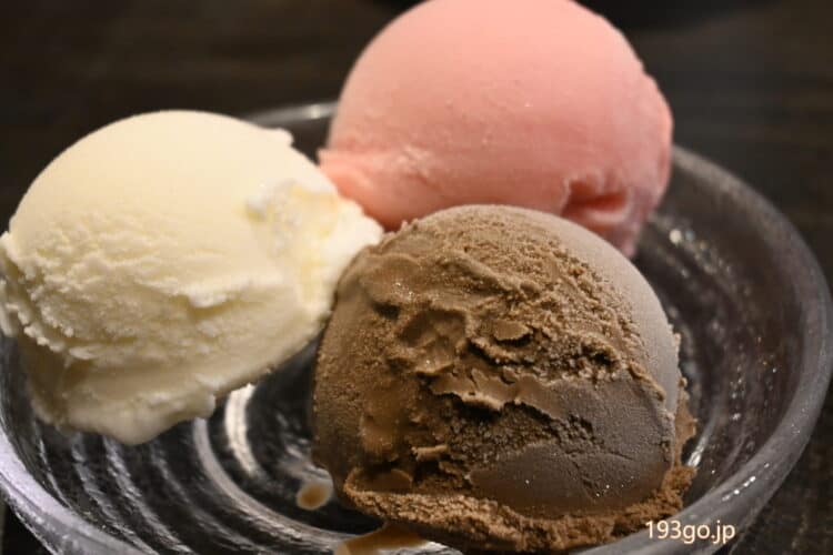 ほうじ茶、塩ミルク、さくらんぼの3色アイスクリーム