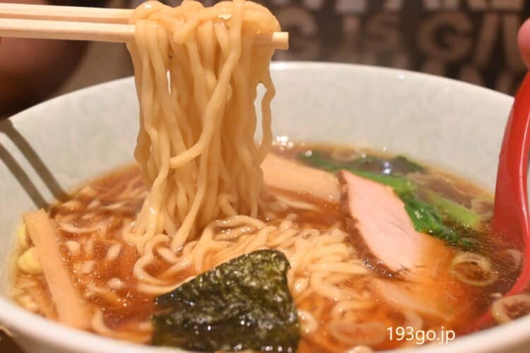 中太ちぢれ麺のあっさりした醤油ラーメン。小松菜やメンマ、ネギ、チャーシューなどのトッピング。