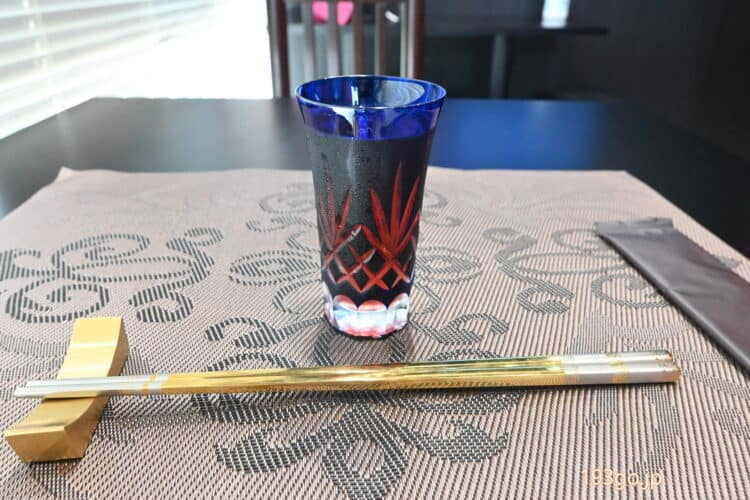 始めの料理はキレイな前菜盛り合わせ。ピカピカのゴールドのお箸でいただきます!