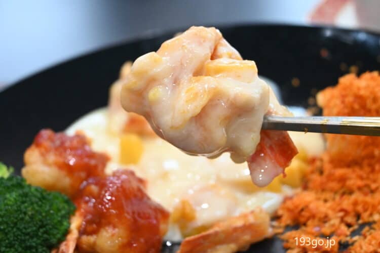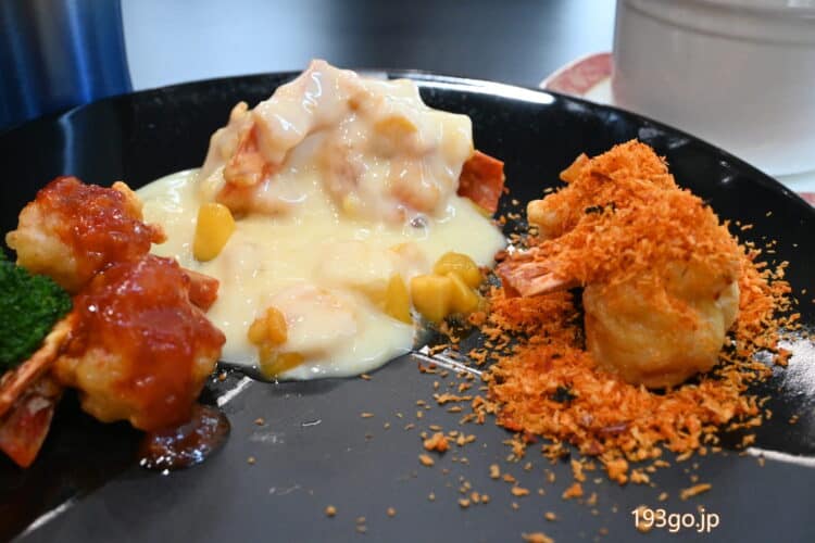 メインは、豪華!車海老3種盛り マンゴーソースのエビマヨが絶品