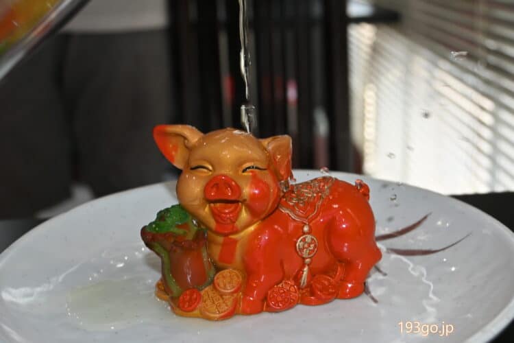 食後にアツアツの紅花茶も。置物にかけると色が変わるのも見せてくれた。^^中国茶も様々な種類があるようなので、スイーツと一緒にティータイムもいいね。