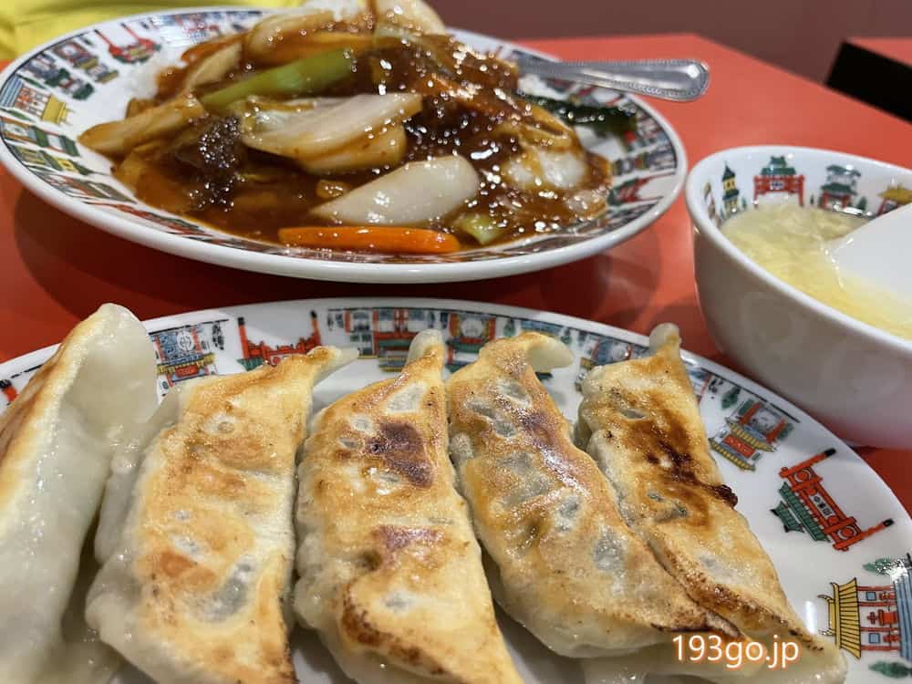 焼き餃子の皮は厚めでカリモチっ。肉の旨みよりも、餡にしっかり味が付いてる感じ。