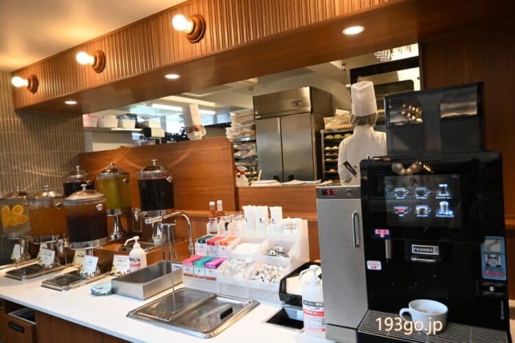 奥はドリンクバーで、冷たい飲み物やティー、コーヒーなどが揃う。