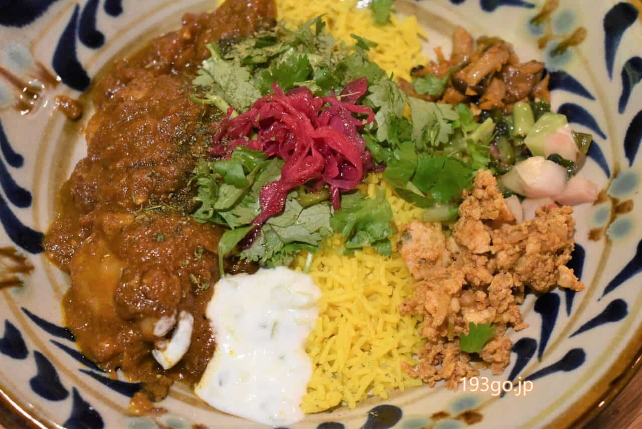 サフランライスに柔らかく煮込まれたチキンのカレー、鶏そぼろ、ヨーグルト、パクチー、ビーツなどが乗り鮮やか。