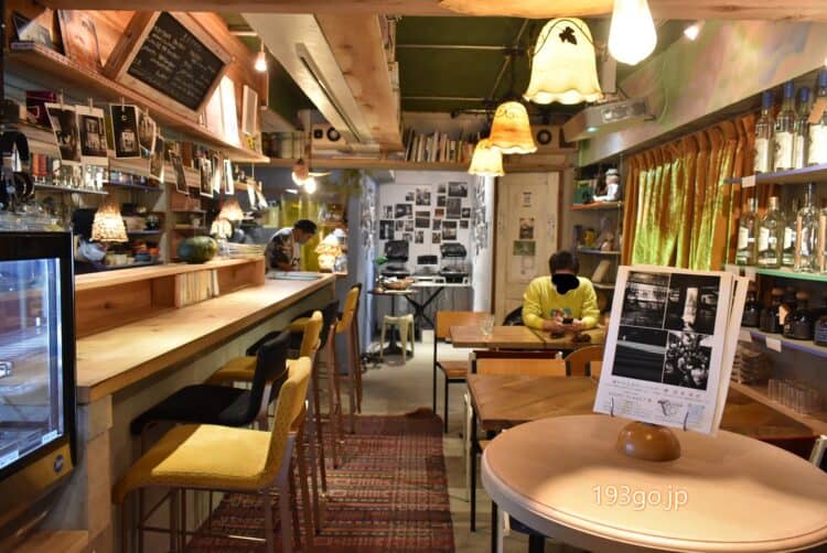 奥行きのある店内、カウンター席とテーブル席があり奥にDJブースも。夜はアーティストが来てお酒も楽しめる様だ。