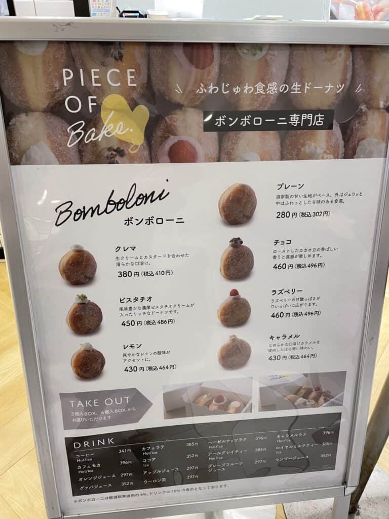「PIECE OF BAKE(ピースオブベイク)」メニューと値段(税込み表記)