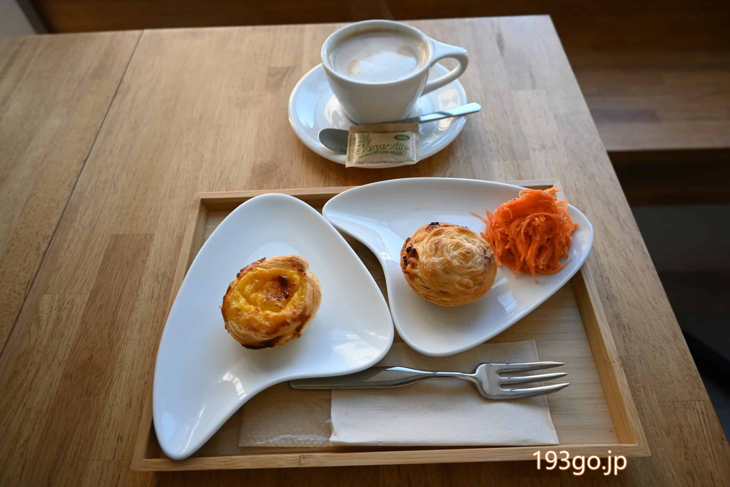 エッグタルト:350円と、ミートパイ:750円、カフェラテ ホット:700円を注文。