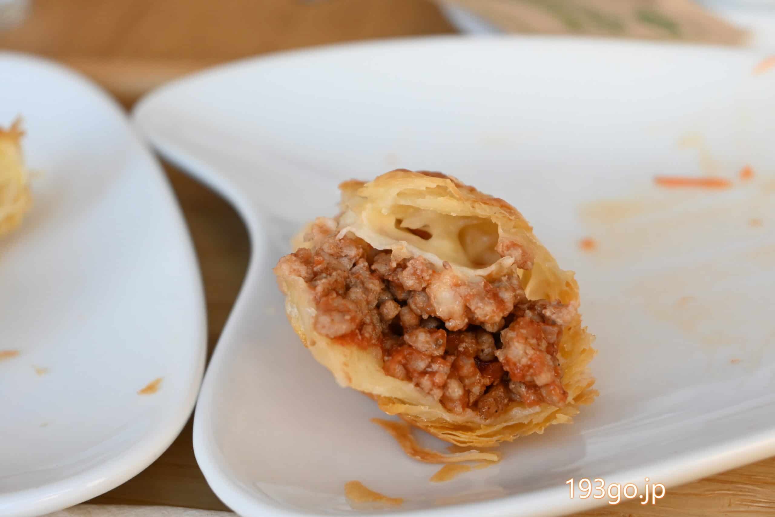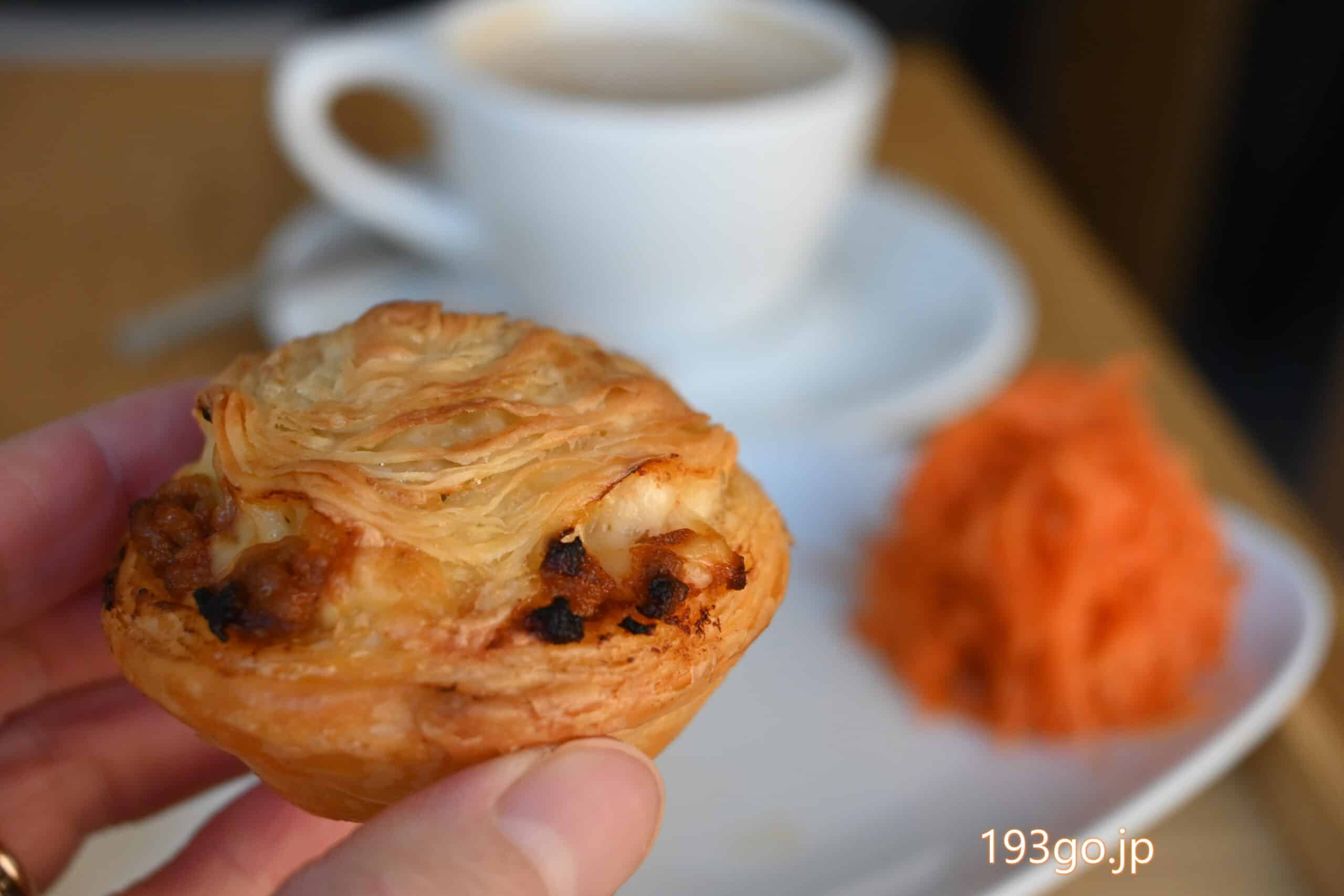 お惣菜タルトには、キャロットラペが添えられ、パイの中はミートたっぷり。キャロットラペもコリコリと食感が楽しく、このペアリングはよく合う。