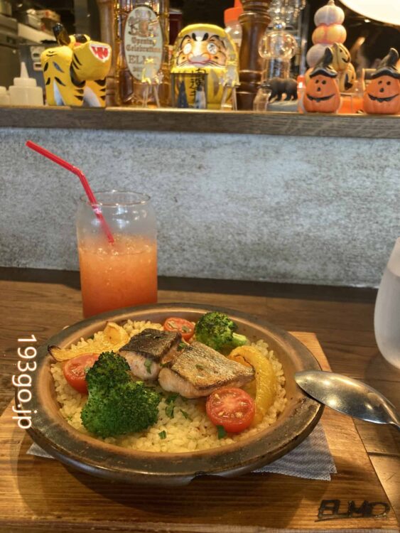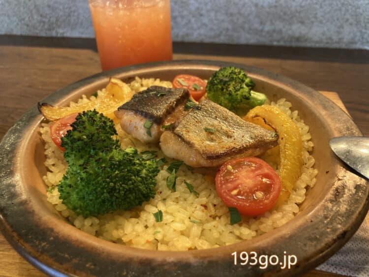 パエリアは、サフランライスにトマトやパプリカ、ブロッコリーに、秋鮭。鮭は身厚でふっくら。