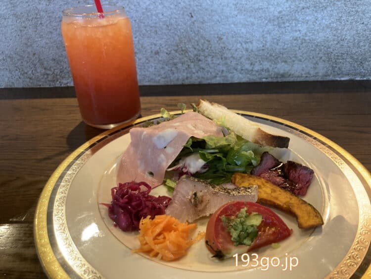 来ました、前菜は、ハムサラダやキャロットラペ、グリルトマト、かぼちゃ、カツオにローストビーフなどが乗っていた。軽めでペロリ!ちょっとずつ楽しめる8種盛りで彩りが良い。