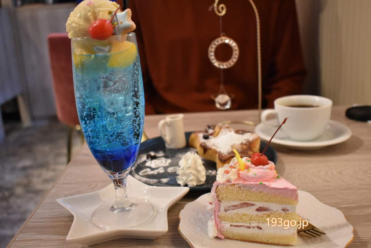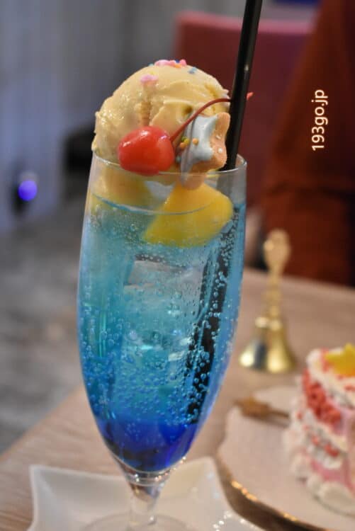 星座のクリームソーダは、前回は自分の星座のおうし座にしたので、今回は色で選び、鮮やかなブルーにマンゴーが浮かんだ「かに座」に。バニラアイスとさくらんぼに星型クッキーも飾られ華やか。シュワっと