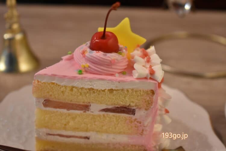 真っピンクのクリームのショートケーキ。断面の層がキレイ