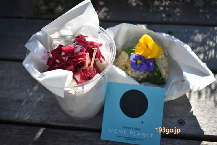 ホームプラネットの大豆ミートの唐揚げと、お花のチラシおにぎりをゲット。