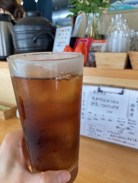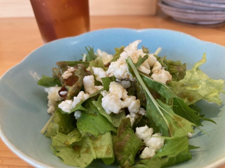 冷たい麦茶に、サラダ、小鉢、みそ汁付きも嬉しい!