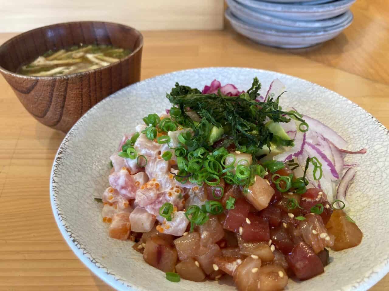 福郎丼よりも細かくぶつ切りにされた鮮魚は、島とうがらし醤油和えとびっ子マヨネーズ和えの合い盛りだ。