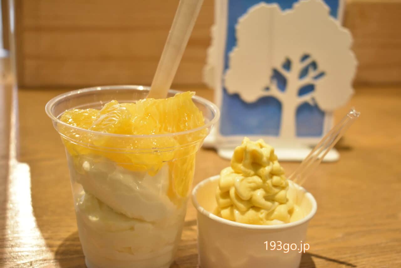 2種チョイス出来るダブルや、+100円で生クリームと果肉を乗せてくれるミニパフェも。
