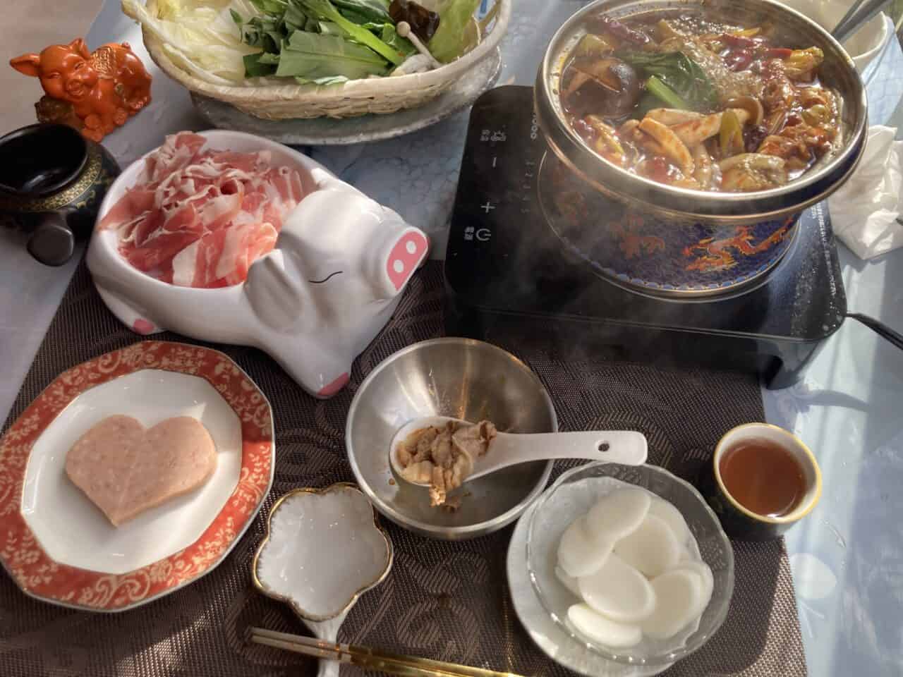 白菜や小松菜、空心菜、人参、シイタケ、キクラゲなどのきのこ類に、ハート形に盛り付けれたスパム、韓国のお餅も。