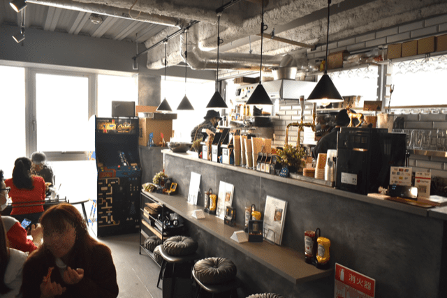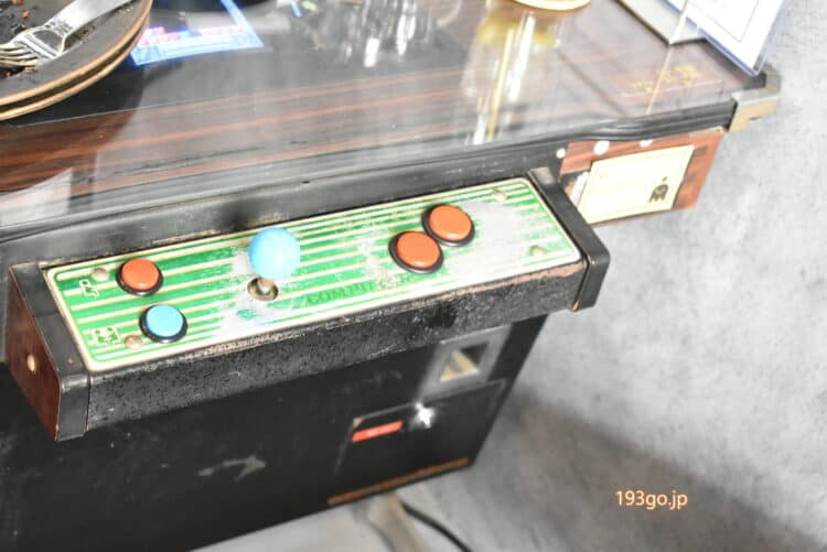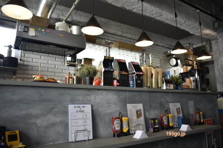 アーケードテーブル筐体と、ゲーム台が置かれた日本初のアーケードゲーム×ハンバーガー屋。レトロで映えてる
