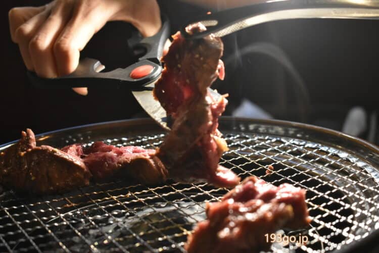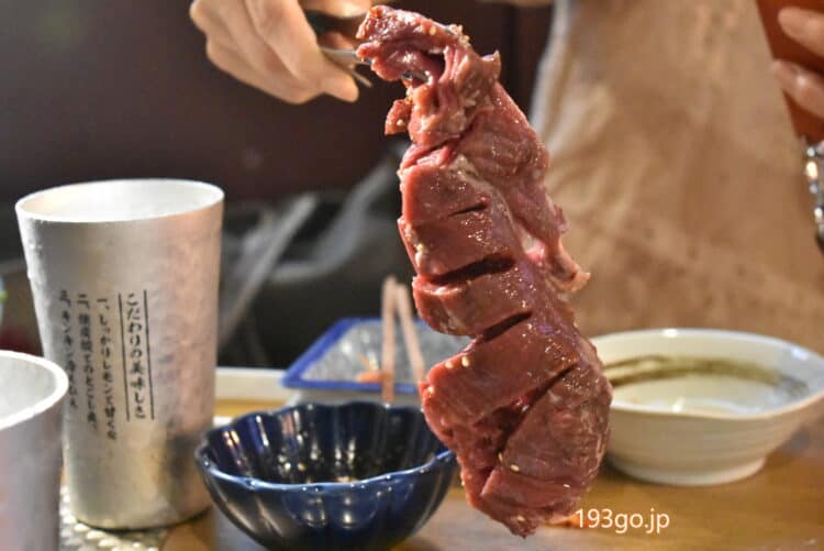 超厚切りロ~ングなハラミはハサミでジョキジョキ、食べ応えあり!