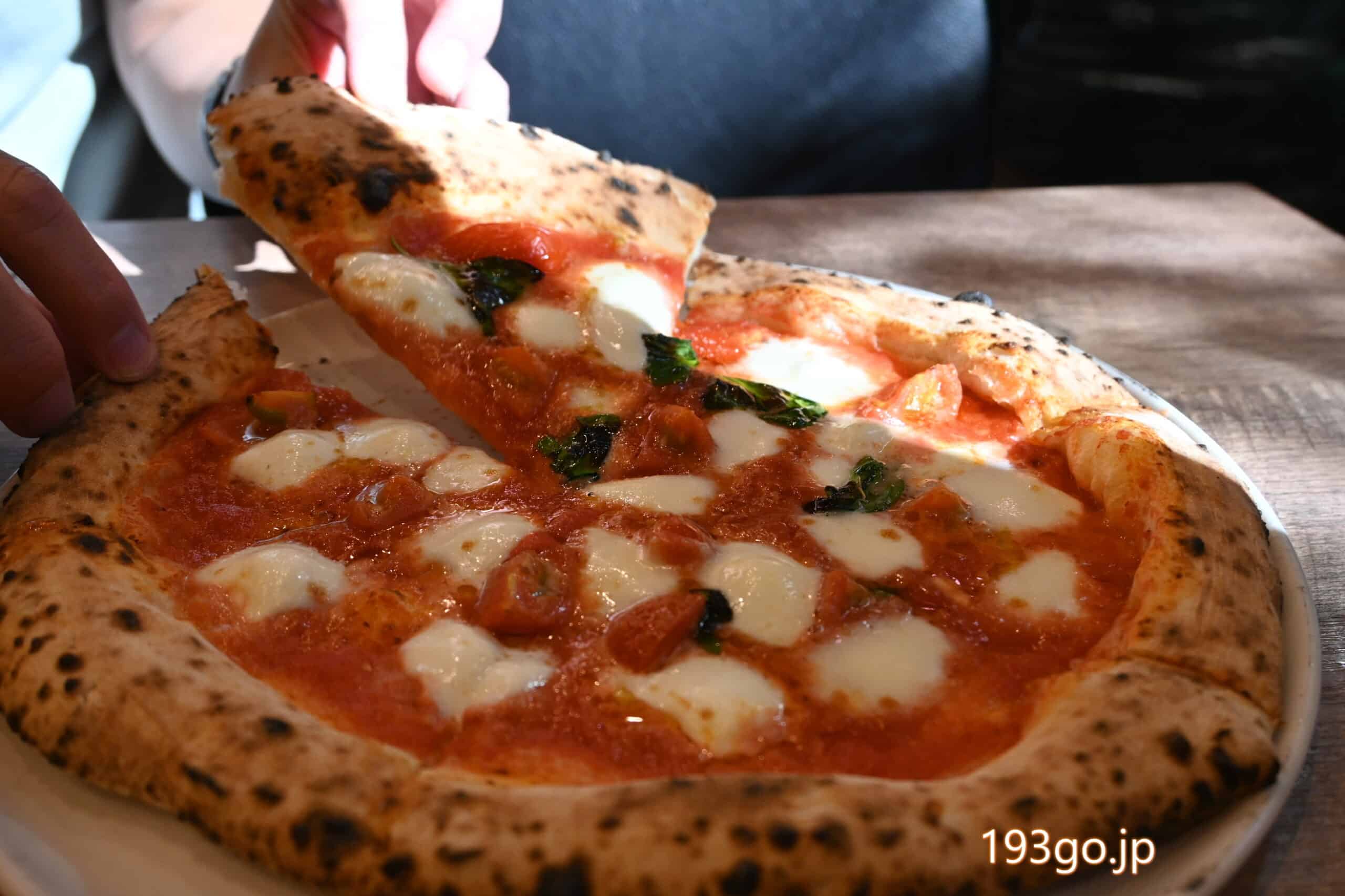 もちもちの生地に、ジューシーなトマトソース、フレッシュトマト&バジル、水牛モッツァレラがポコポコと乗ってて、食欲をそそる。