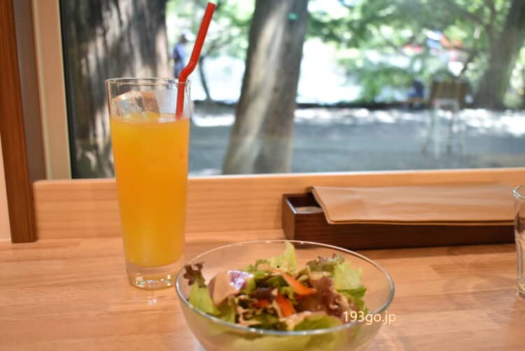 目の前に噴水が見えるカウンター席で。窓も多く、公園の緑に囲まれた気持ちが良い店内。