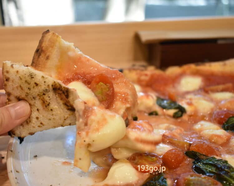 もっちもちの生地に、ジューシーなトマトソース、フレッシュトマト&バジル、水牛モッツァレラがポコポコと乗ってて、食欲をそそる!