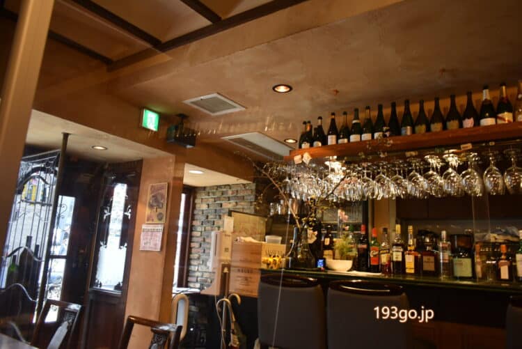 カウンターにワイングラスやボトルがズラリ!ディナーや休日の午後から飲みながら楽しむ雰囲気かな