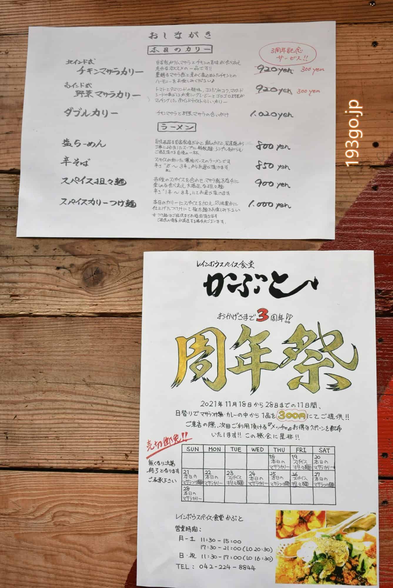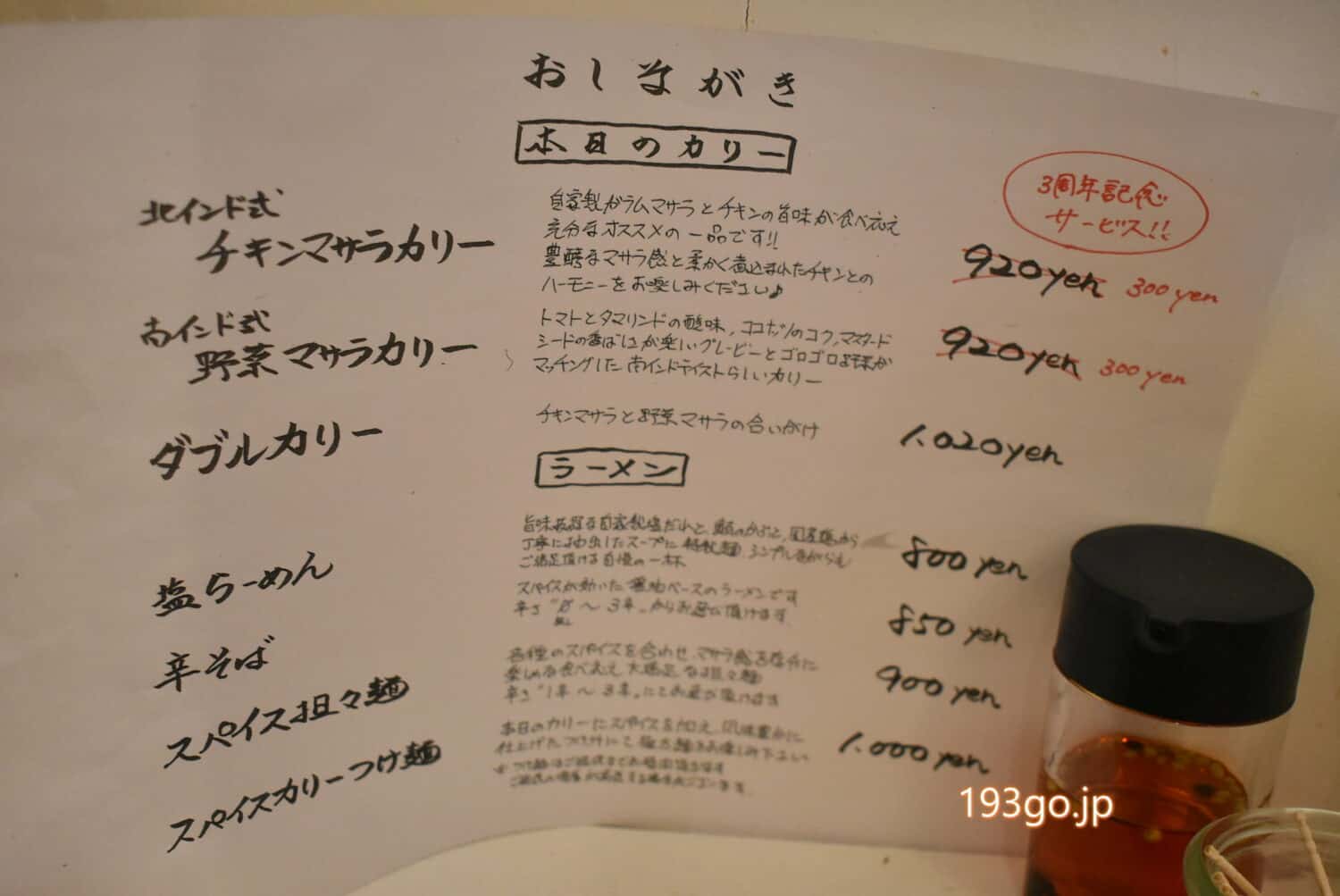 周年祭メニューは日替わりでマサラカレー、マサラつけ麺、スパイス担々麺が楽しめる。店頭のカレンダーでチェックできる。