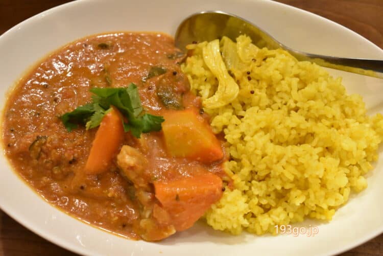 サフランライスに大根や人参がゴロゴロ入りのルーがかけられ、パクチーも乗り鮮やか。