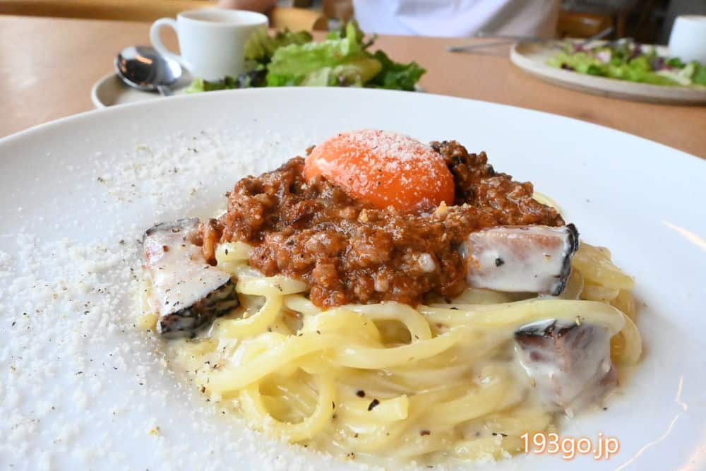 上にかかってるのがボロネーゼのミート、パスタが浸ってる部分がカルボナーラかな。
