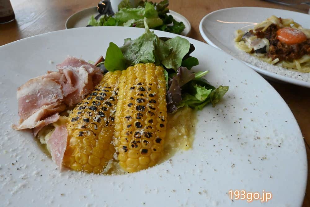 表面が炙られた、鮮やかなトウモロコシがブロック状で乗ってる。