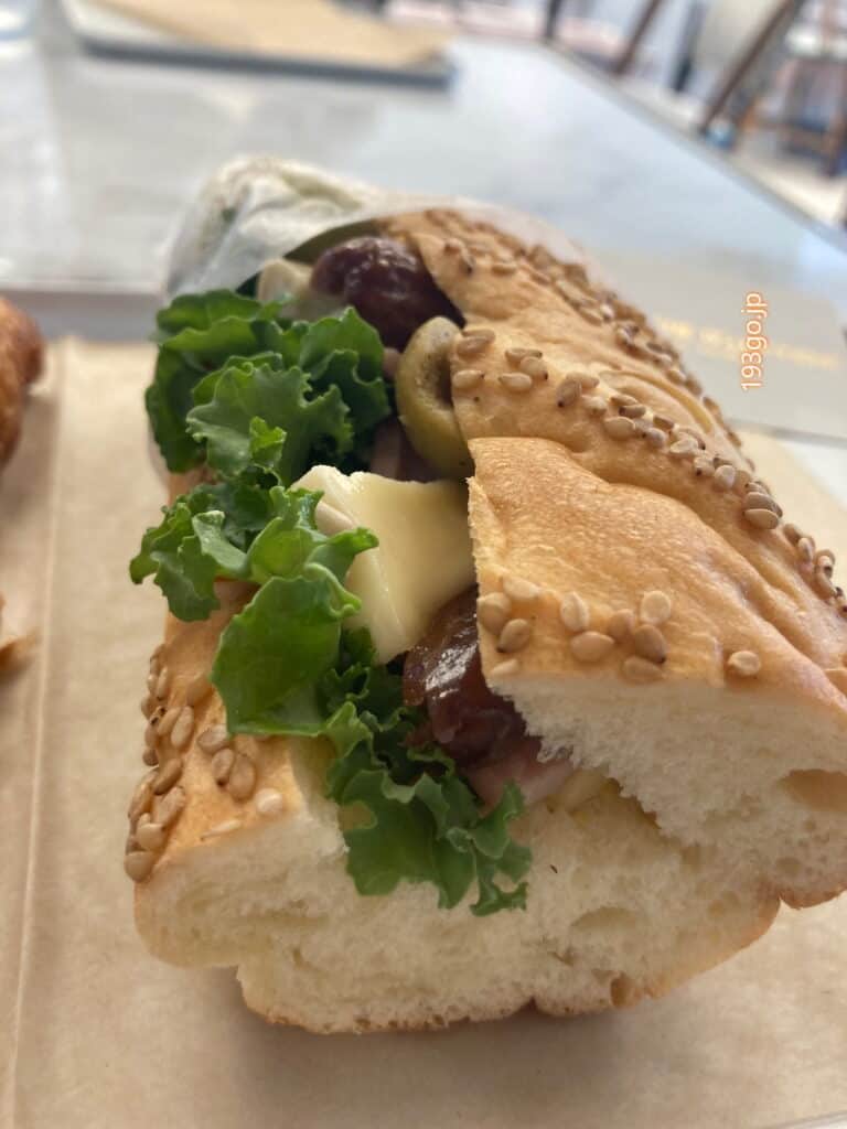 ウッフ(フランス語で卵の意味)と自家製マヨネーズ、鶏ハムを、このサンドの為だけに作っているゴマつきヴィエノワーズのふわふわパンに挟んだサンドイッチ。