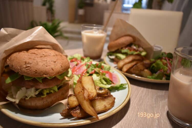 メニューはハンバーガーがメインで、大豆ミートやライ麦パンなどの植物由来。