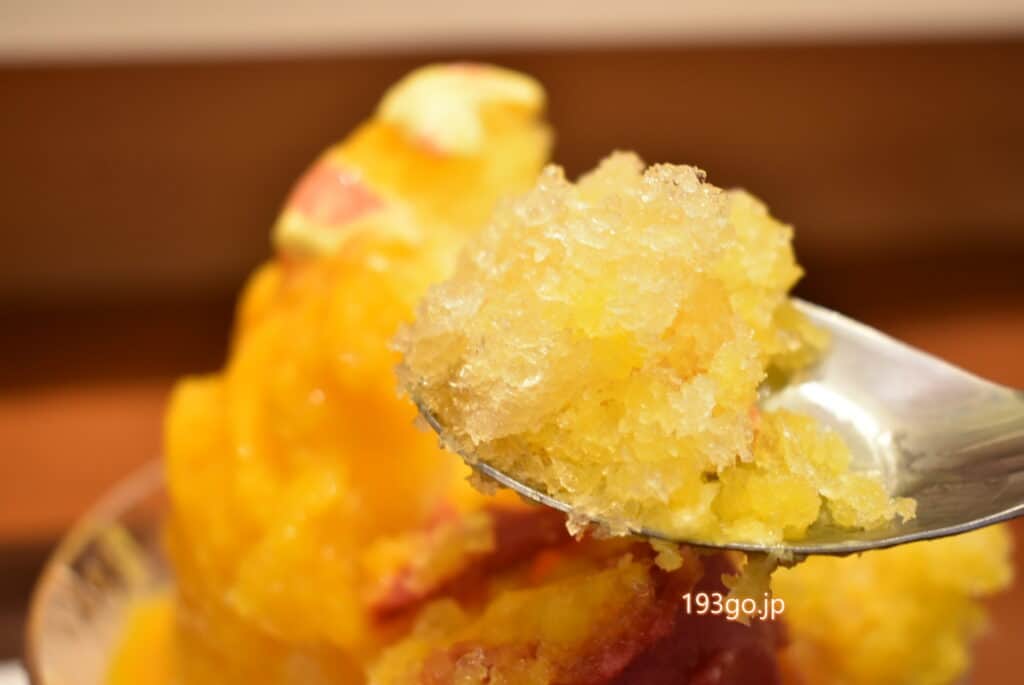 氷はシャリシャリでシロップが浸みてる。マンゴーの果肉もゴロゴロで食べ応えのあるかき氷!暑いときに一気に冷んやり出来る。