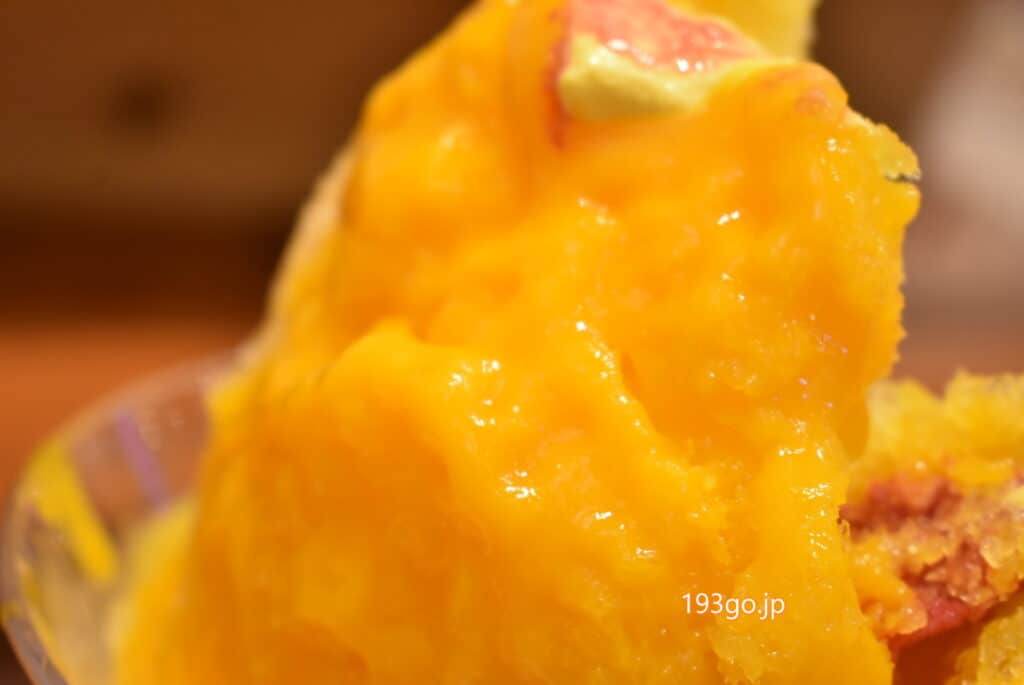 甘くてジューシーなマンゴーソースがたっぷりかかったかき氷