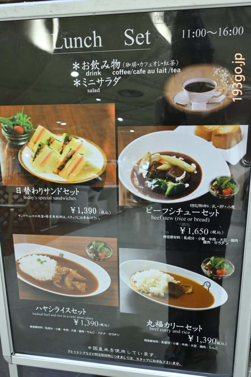 11:00~16:00までのランチメニューは、ハヤシライスや丸福カレー、ビーフシチューなどがあり、サラダとドリンク付きで1,390円~。