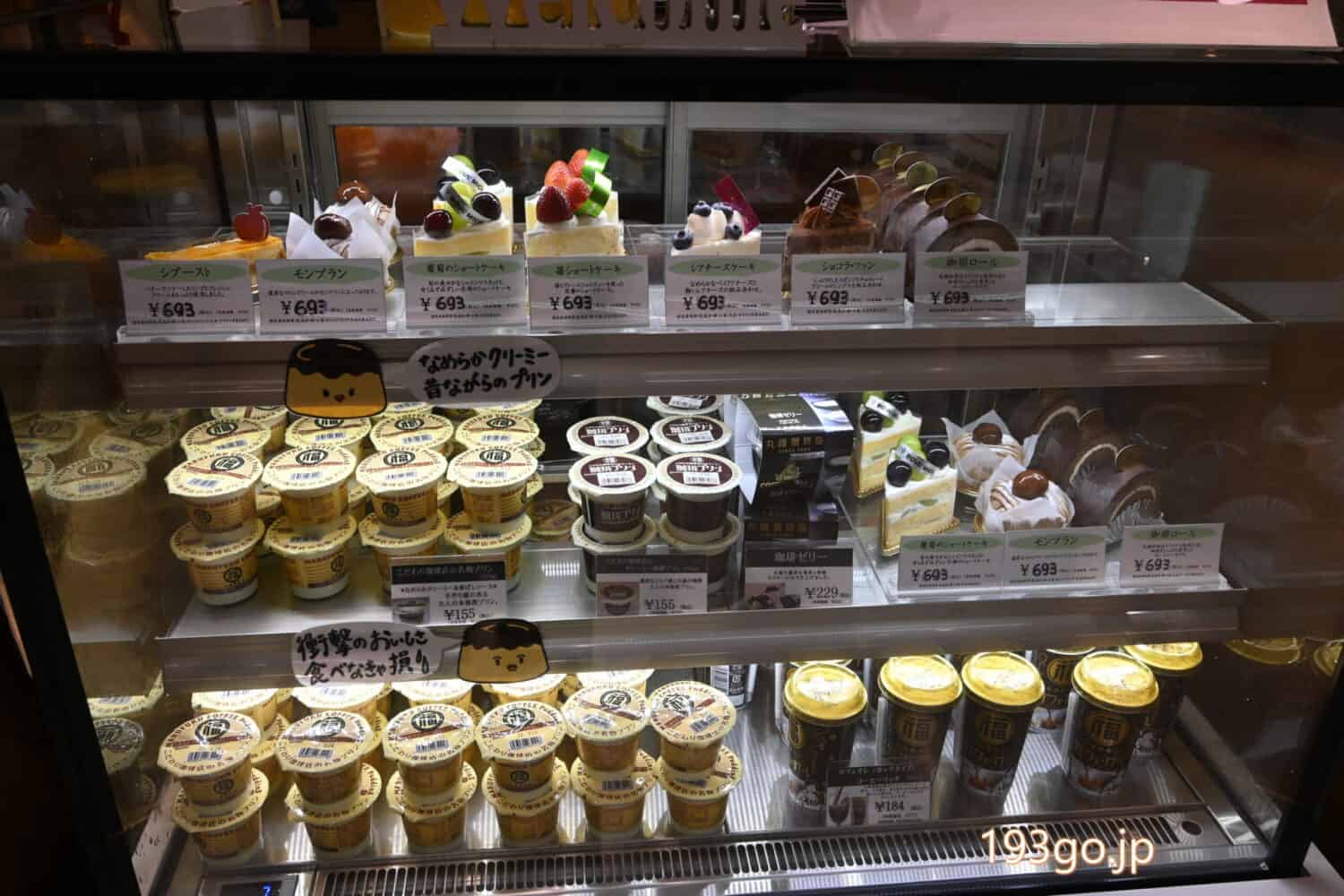 ショーケースに並ぶ珈琲ロールや、ぶどうのショートケーキ、プリンも美味しそう!ケーキセット1,240円。