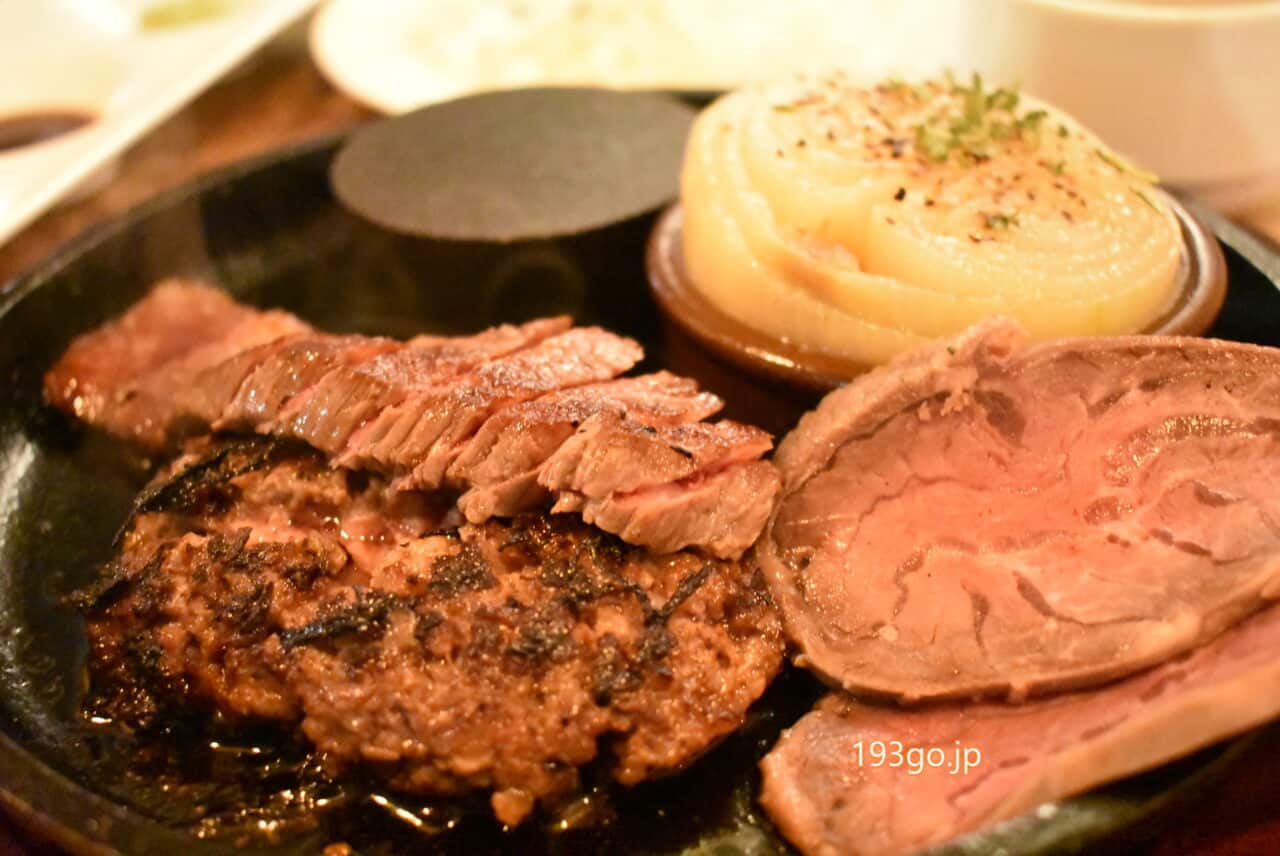 ジュージューっと音を立てながら鉄板に盛られたアツアツステーキ&ハンバーグ。煮込んだジューシーオニオン付き!