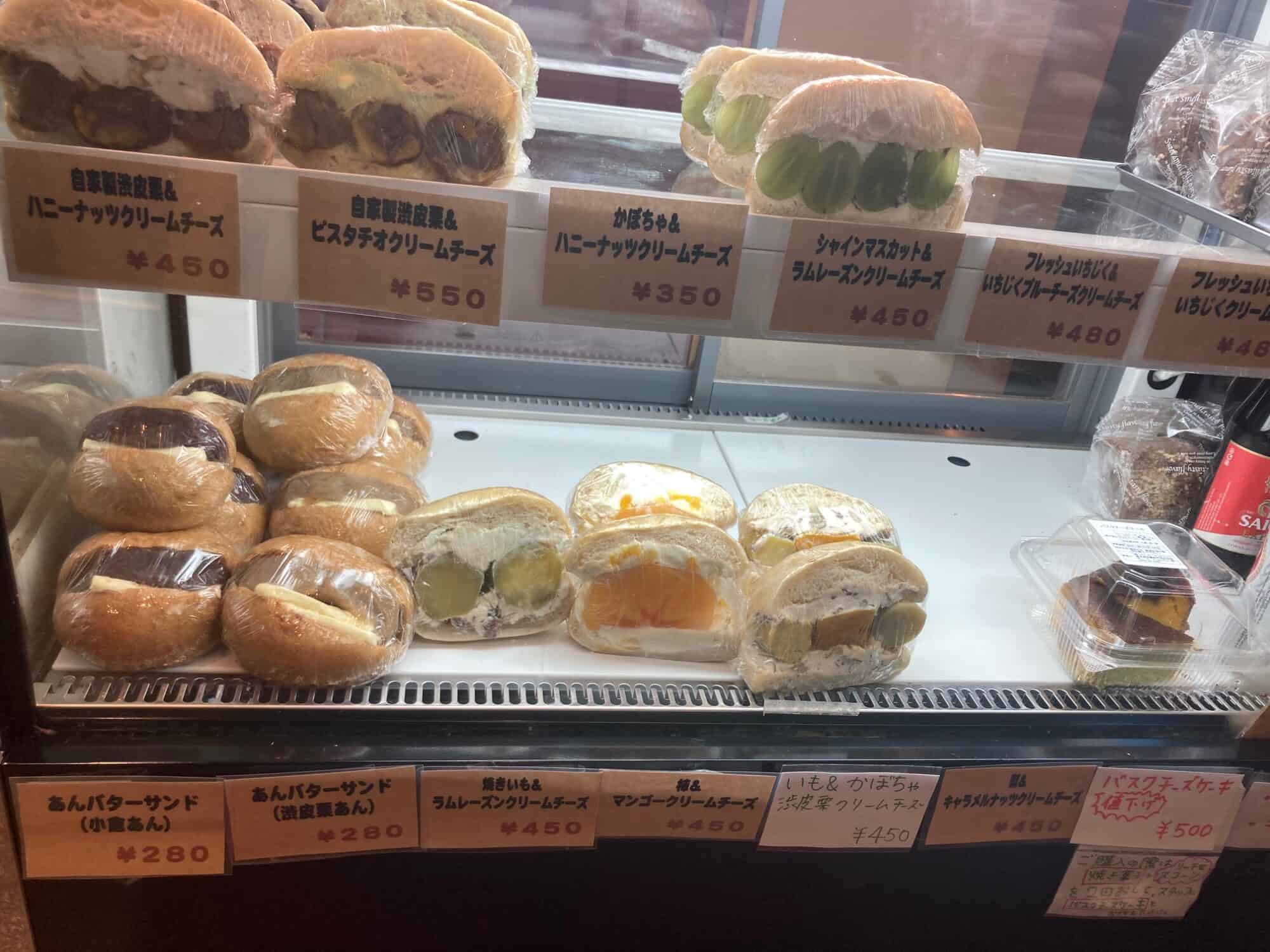 入って左手にある冷蔵ケースに並ぶのは、渋川栗やさつまいも、シャインマスカット、柿、イチジクなど季節フルーツをゴロっと挟んだスイーツパン「もっちりパンサンド」