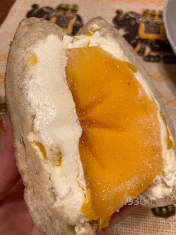 マンゴーの果肉はクリームチーズの中に練り込まれてた。
