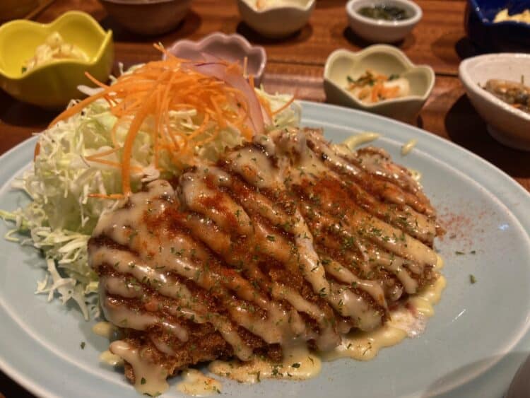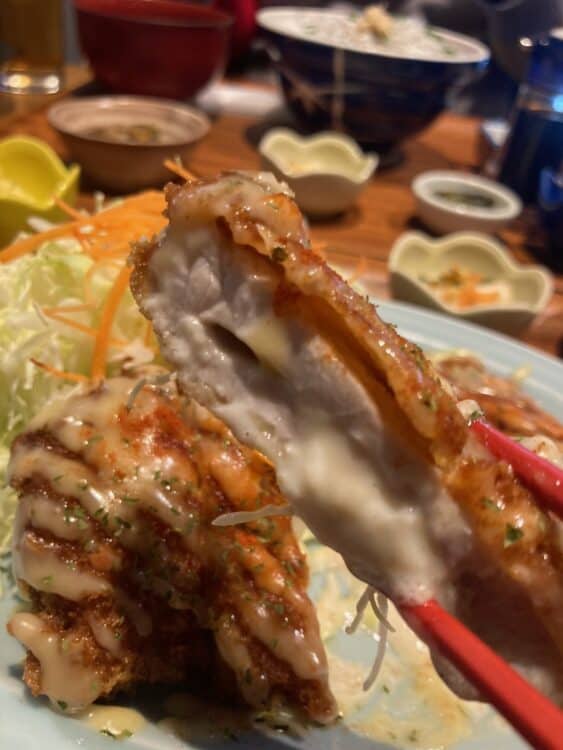 カツは柔らかく、酸味ある甘辛いスイートチリマヨソースがたっぷりかかってジューシー。タレがしっかり味で、チーズは控えめ。