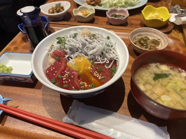 ご飯の上にふっくら釜あげしらすと漬け鮪が満遍なく。卵の黄身も落してある