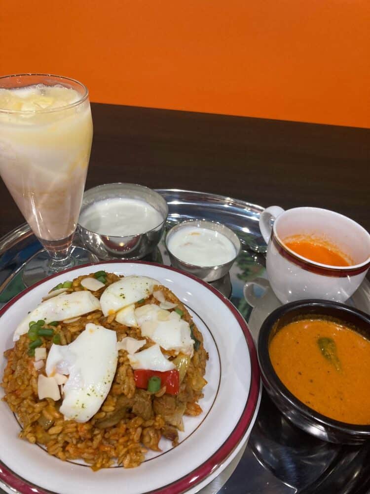 ラッシーとサラダ、スープ、カレー付きの欲張りビリヤニセット