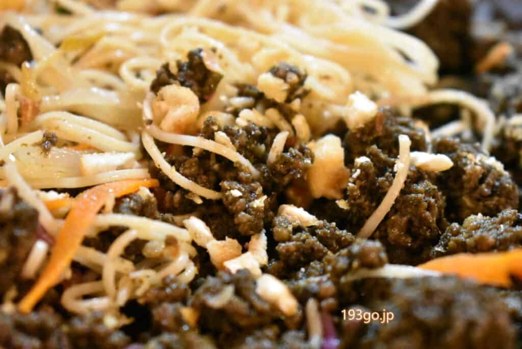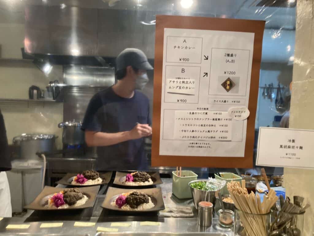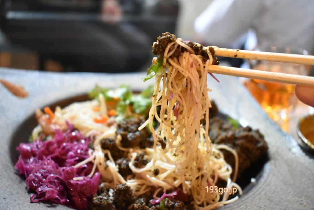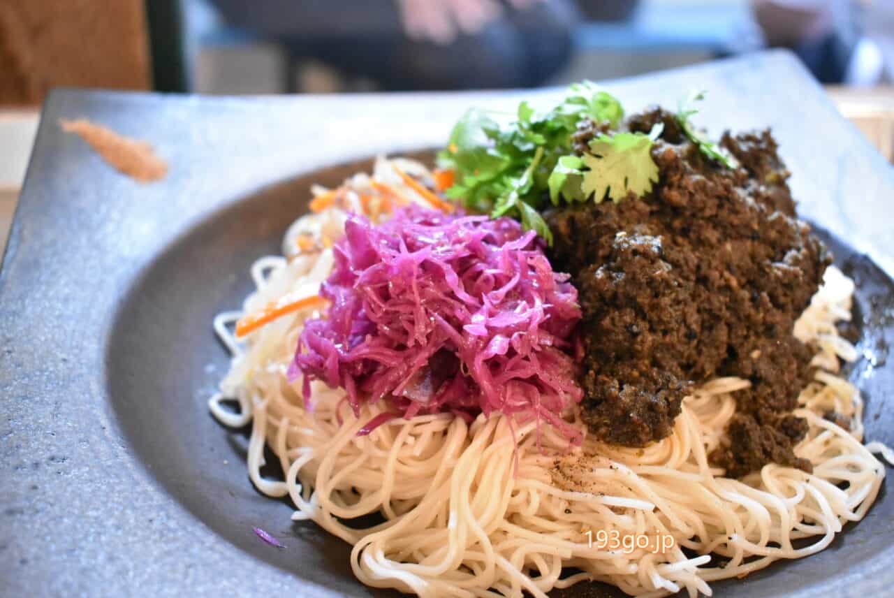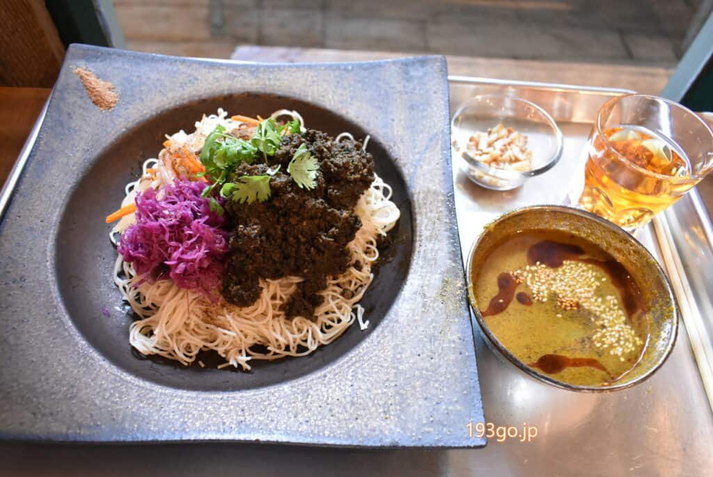麺はそうめんかな、もちもちっとした細麺の上に黒胡麻のキーマカレー的なものがゴロっと乗りインパクト大!
