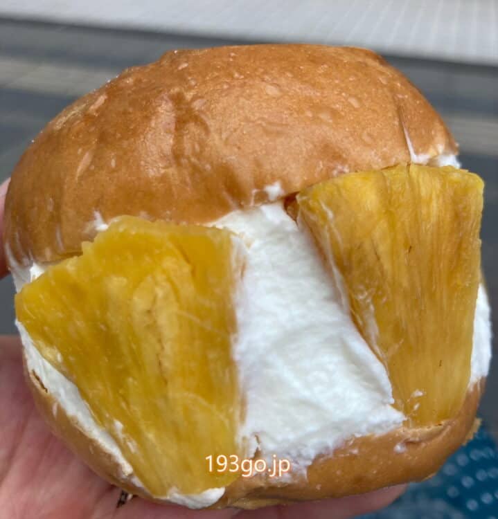 ふわふわの軽いブリオッシュ生地になめらかな甘さ控えめの生クリームがたっぷり~。パインも大き目カットでクリームの中にも!