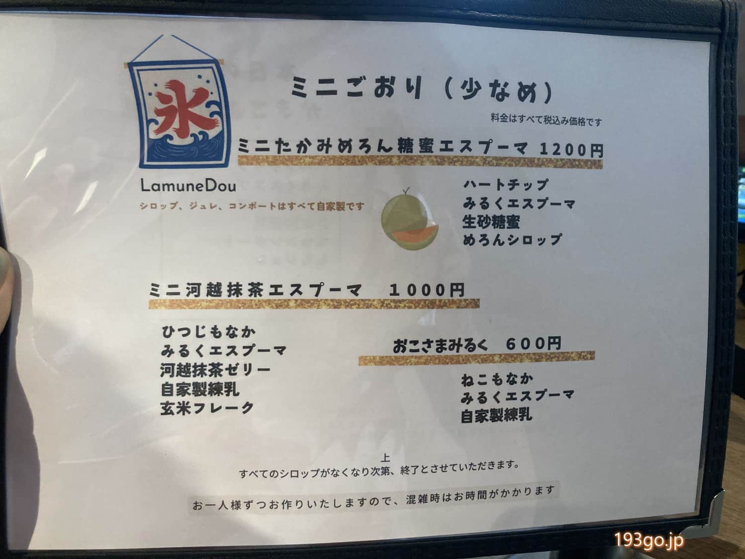 かき氷のメニュー 本日のかき氷2種、ミニサイズも